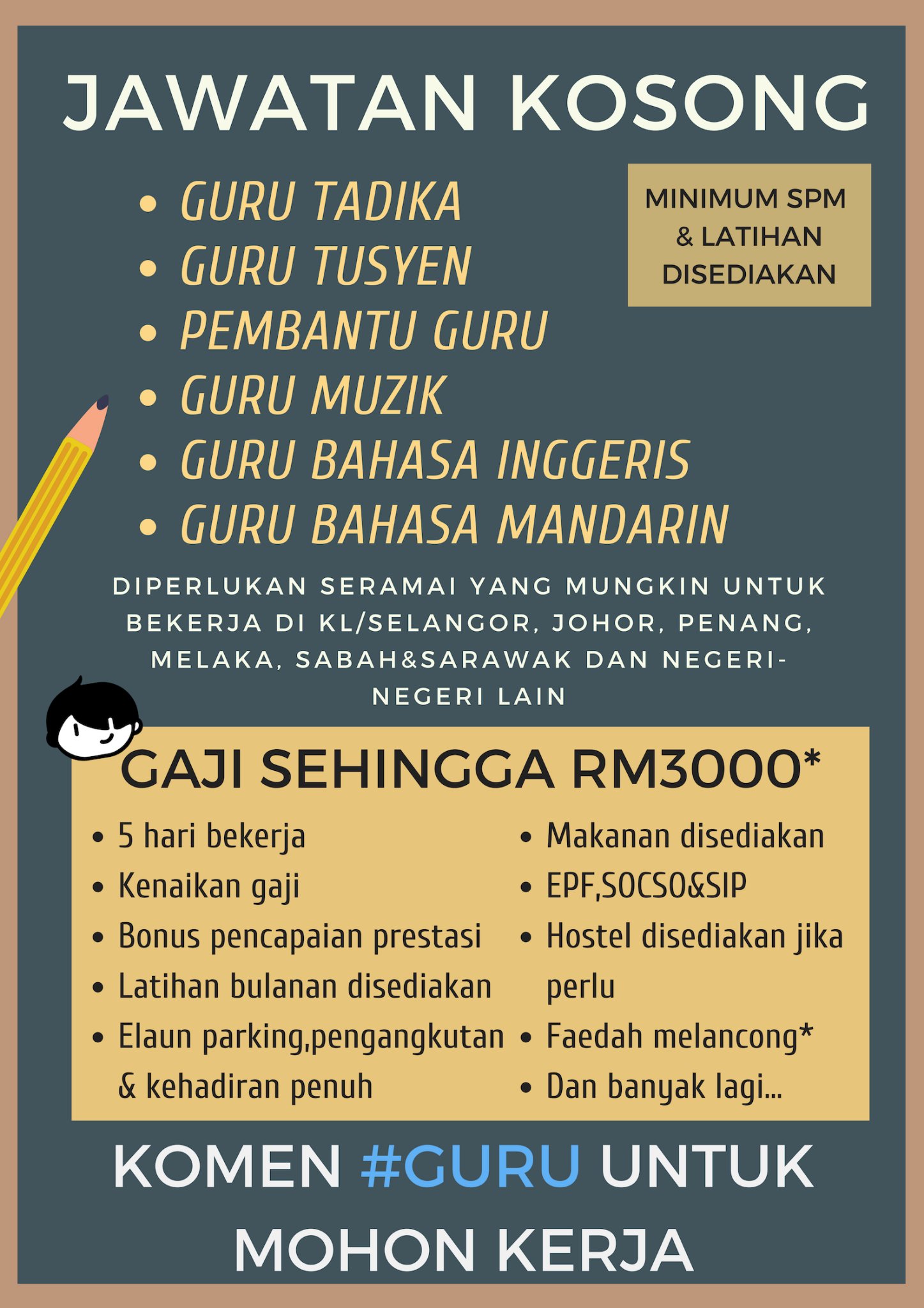 Maukerja On Twitter Jawatan Kosong Guru 2018 Min Spm Latihan Disediakan Gaji Sehingga Rm3000 Pengambilan Untuk Negeri Kl Selangor Johor Penang Melaka Sabah Sarawak Dan Negeri Negeri Lain Admin Drop Link Kerja Di Reply Https T Co Mzhflbsdh2
