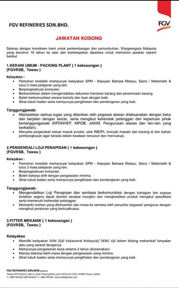 My Tawau Official On Twitter Iklan Jawatan Kosong Di Fgv Refineries Sdn Bhd Tawau 1 Kerani Umum Packing Plant 1 Kekosongan 2 Pengendali Loji Penapisan 1 Kekosongan 3 Fitter Mekanik
